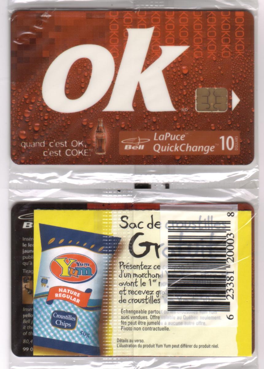 This collectible chip card is a Coca-Cola stored value card from Canada. The front of the card prominently features the iconic Coca-Cola logo on a vivid red background. The phrase "When It's OK It's Coke" appears clearly on the card, along with a denomination of $10. The card has the brand name Coca-Cola in white script and a white wave graphic beneath it, maintaining the classic look associated with the company’s branding.