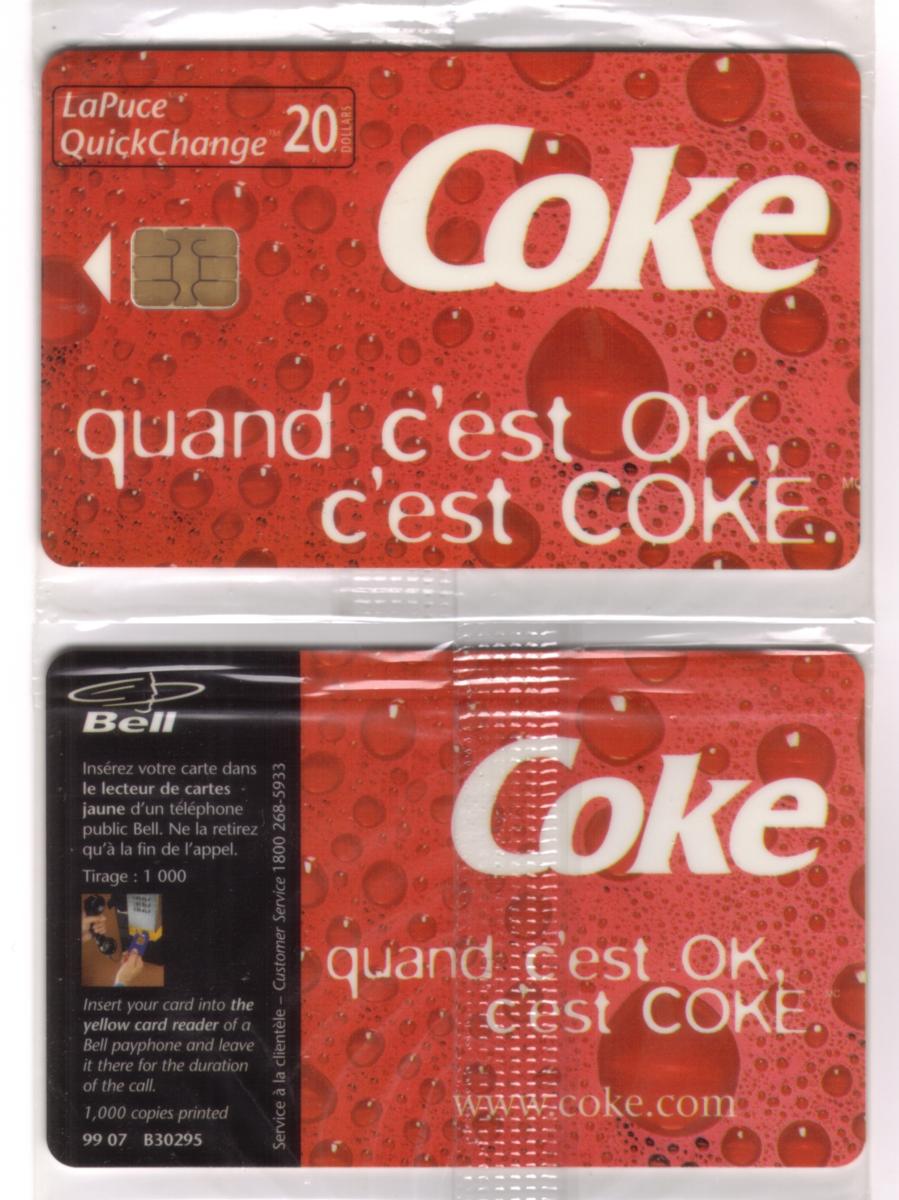 This collectible is sealed and originates from the LaPuce/QC series. It measures as a chip card designed for electronic use, likely intended for service or commercial transactions related to Coca-Cola payments or vending. The card carries exact details matching the product codes and branding, making it a precise collectible for those interested in Coca-Cola memorabilia or stored value cards issued in Canada.