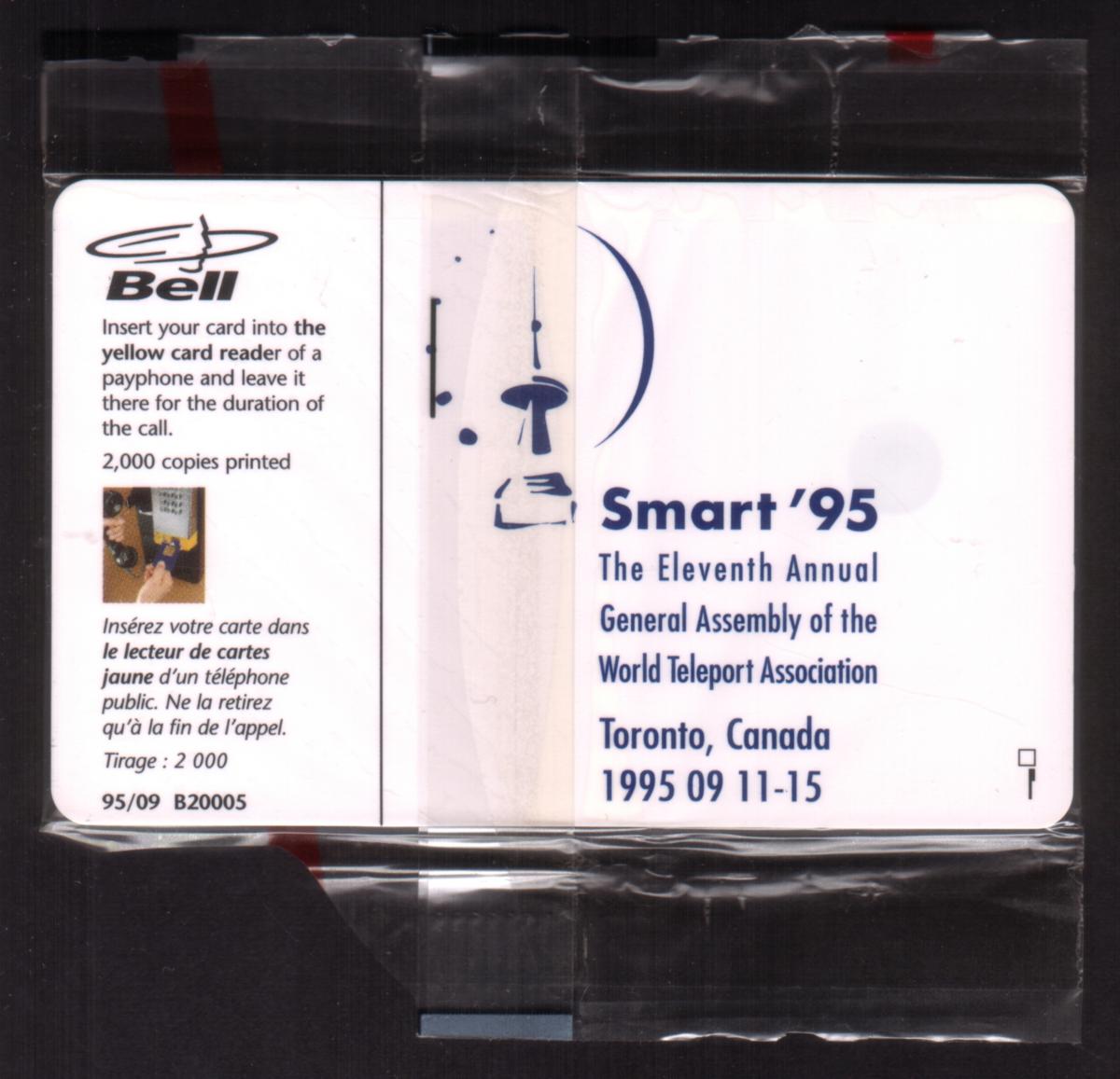 Issued for the eleventh annual general assembly of the World Teleport Association, this card is associated with the 1995 Smart series and the Toronto World Teleport Association Show event. The card is a stored value card (SVC) designed for convenient payphone use, integrating chip card technology from the mid-1990s. Its design and branding reflect Bell's telecommunications prominence in Canada during that period.