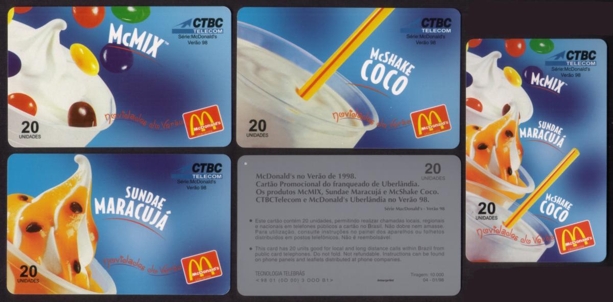 In addition to the dessert imagery, the card displays the McDonald’s logo, affirming the connection to the restaurant chain. The card includes logos of CTBC and Telebras, Brazilian telecommunication companies, indicating the card's function as a phone card for telecommunication services. The overall color scheme is warm and inviting, with a design that reflects a 1998 promotional theme centered on McDonald’s ice cream treats in Brazil.