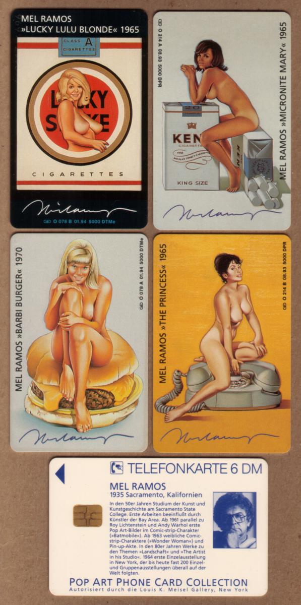This collectible chip card from Germany features artwork by Mel Ramos, an American pop artist known for his vibrant and bold style. The card showcases four different images reflecting Ramos’ iconic themes involving commercial product imagery and pin-up style figures. Included are depictions of “Lucky Lulu Blonde,” "Micronite Mary," "Barbi Burger," and “The Princess,” characters emblematic of Ramos’ blend of advertising icons and female form.