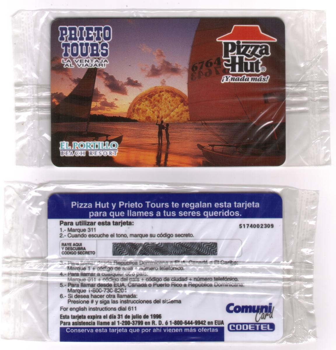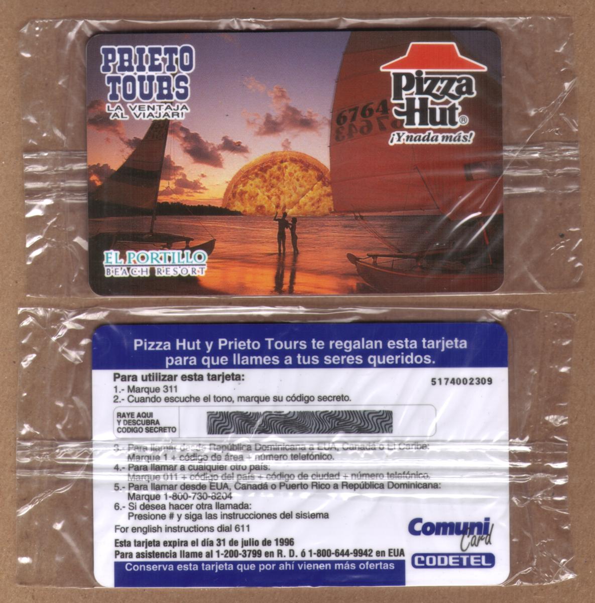 This collectible phone card from the Dominican Republic features branding for Codetel, Pizza Hut, and Prieto Tours, promoting El Portillo Beach Resort in 1996. The card is sealed and issued by Communicard, a recognized phone card provider. The design includes logos for Codetel, Pizza Hut, and Prieto Tours, clearly marking a partnership or promotional campaign tied to this resort destination.