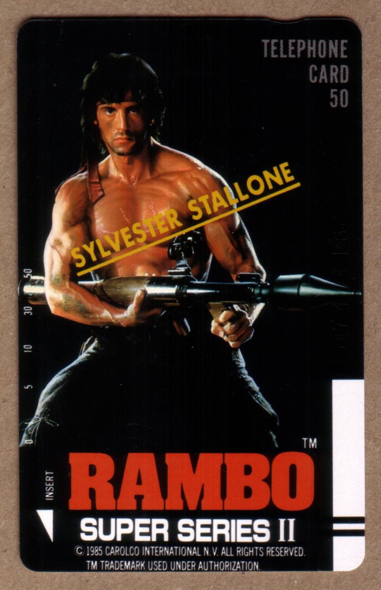 This collectible telephone card from Japan features Sylvester Stallone in his iconic role as John Rambo. The card prominently displays a muscular Stallone holding a rocket launcher, set against a black background. The text "SYLVESTER STALLONE" appears diagonally in yellow across Stallone's chest. In the upper right corner, the card reads "TELEPHONE CARD 50," indicating its phone credit value.