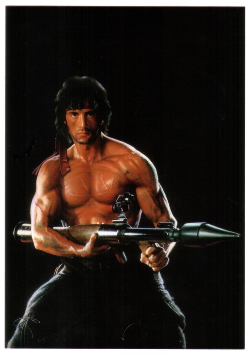 This item is connected to the 1985 Carolco International release of the Rambo series and is accompanied by a movie promo postcard featuring Sylvester Stallone. It is part of the 13233 Rambo Super Series II Movie Promo collection, with the card itself being in mint condition and having no holes.