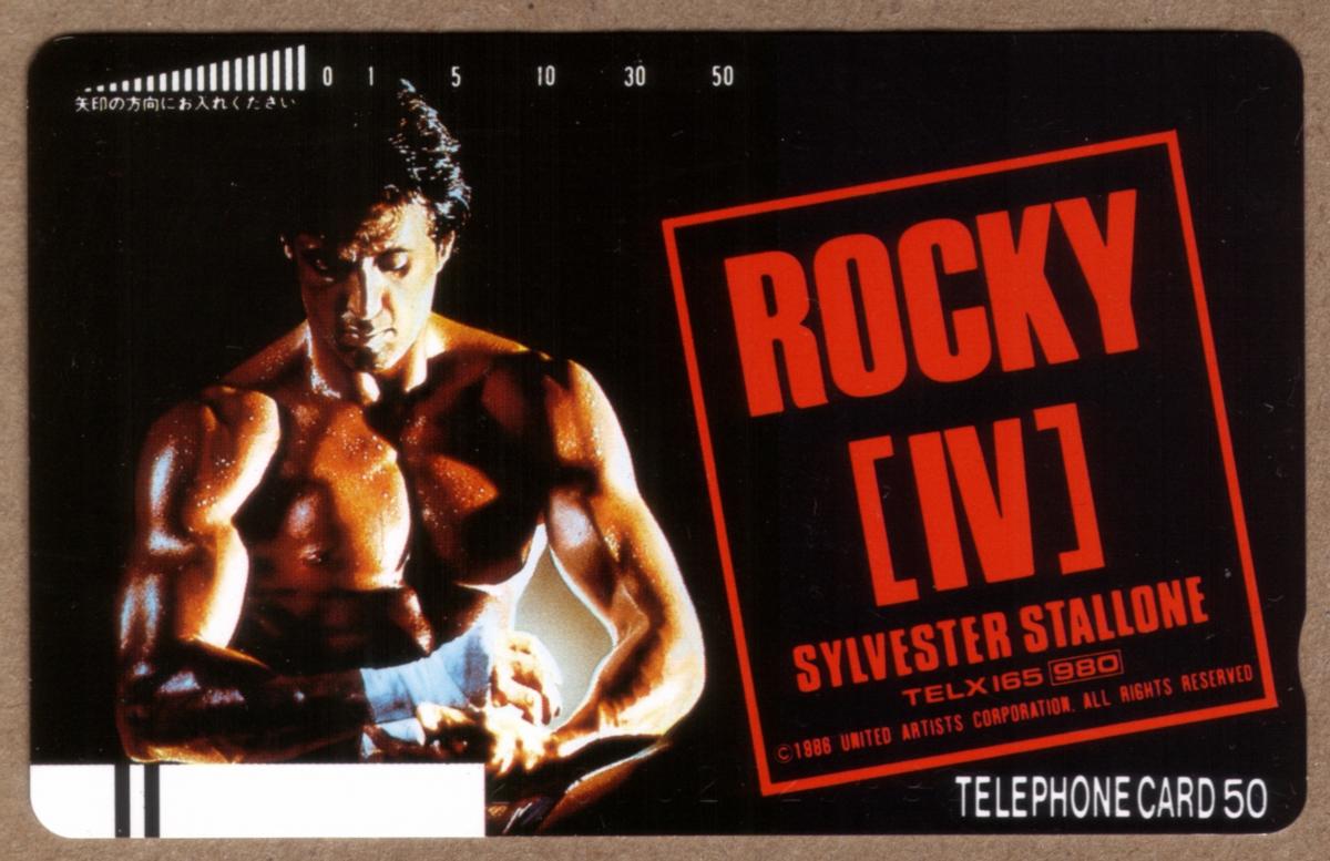 The right side of the card has the text "ROCKY [IV]" prominently displayed in large red letters, with "SYLVESTER STALLONE" underneath in smaller red text. Below the actor’s name, the card states, "©1986 UNITED ARTISTS CORPORATION. ALL RIGHTS RESERVED." The bottom right corner includes the label "TELEPHONE CARD 50," indicating its value for use as a phone card.