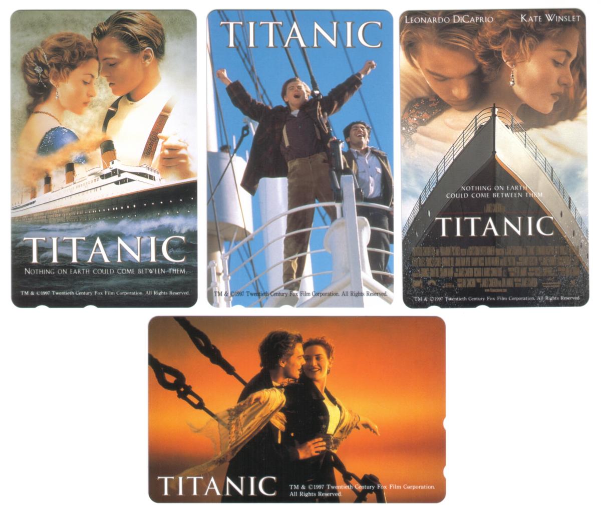 The card is in mint condition with no holes punched. The high-quality print and layout are designed to appeal specifically to collectors of movie-themed phone cards from Japan. The card effectively showcases the iconic 1997 film "Titanic" starring Leonardo DiCaprio and Kate Winslet, distributed by Twentieth Century Fox.