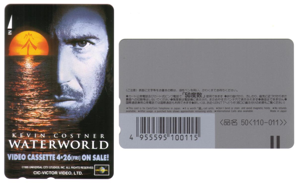 Overall, this collectible phone card serves as promotional material from the time of the "Waterworld" movie video cassette release in Japan. It represents both the film and the collaboration between Universal City Studios and CIC-Victor Video, specifically for the Japanese market. The presence of Kevin Costner’s name links it directly to the star of the film, enhancing its appeal as a collectible item for fans and collectors of movie memorabilia.