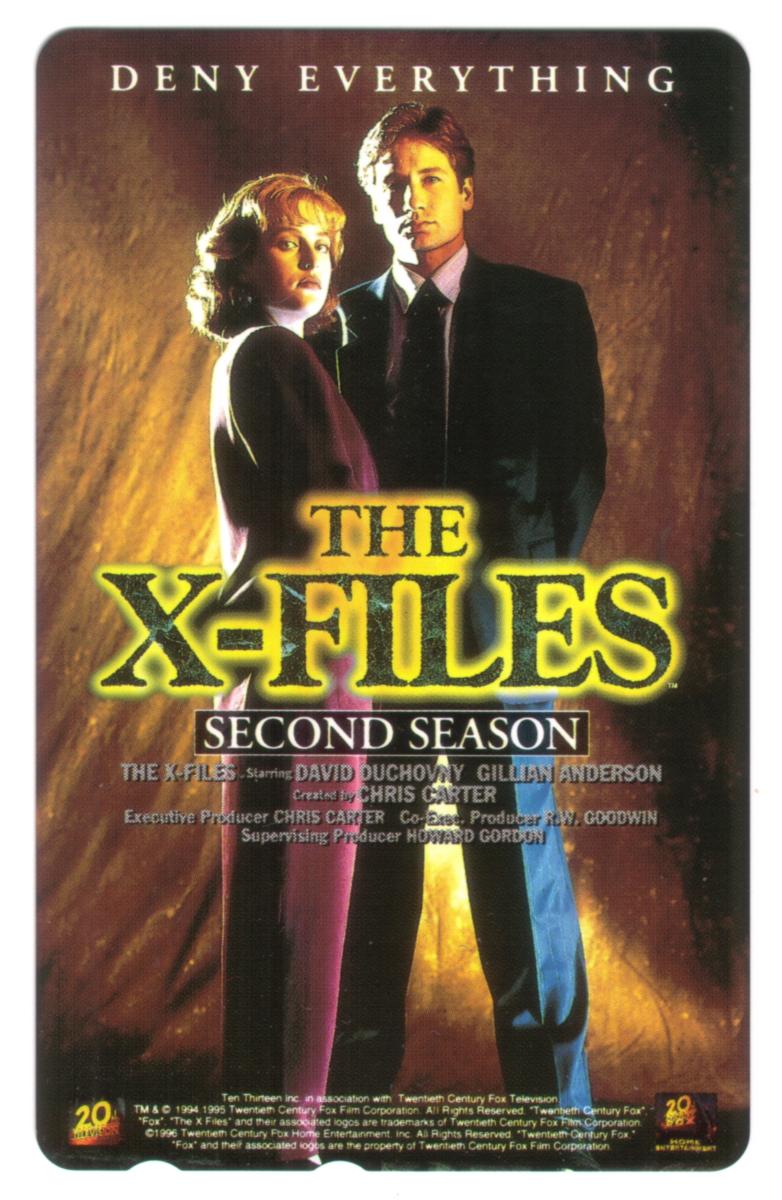 This collectible phone card is a promotional item from Japan tied to the X-Files TV show, specifically from the second season. The card features photographic images of the lead actors Gillian Anderson and David Duchovny, known for their roles as Dana Scully and Fox Mulder in the science fiction thriller series. The text on the card includes "X-Files 50u," indicating the card’s value or usage amount.