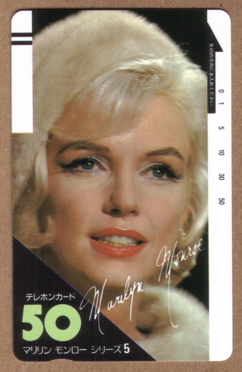This collectible phone card from Japan features a close-up headshot of Marilyn Monroe. The image captures Marilyn Monroe with her iconic platinum blonde hair styled softly around her face, her makeup highlighting her eyes with dark eyeliner and mascara, and her lips painted with a classic red lipstick. The photo presents a clear and vibrant portrait, emphasizing her facial features and glamorous expression.