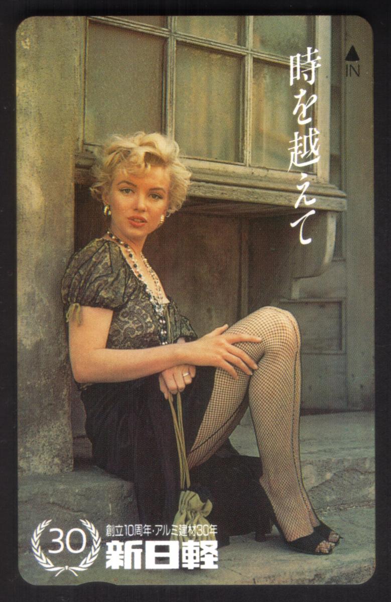 White Japanese text is positioned vertically near Marilyn Monroe's head on the right side of the card. Additional white text and symbols, including the number "30" within a circular laurel design and other Japanese characters, appear near the bottom left, denoting a 30th anniversary related to the company or product. The company name "新日軽" is also printed at the bottom in white characters.