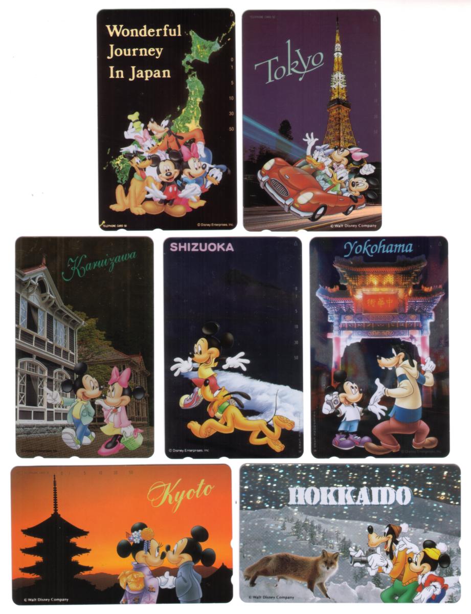 The cards are visually vibrant, pairing classic Disney imagery with distinctive cultural or scenic elements associated with each Japanese city or region. The characters are drawn in their traditional styles and appear prominently on each card, often posed alongside symbolic imagery or backgrounds representing their respective travel destinations. This collection is complete with all seven cards in mint condition, offering a full set that celebrates both Disney's timeless appeal and Japan’s diverse geographical highlights.