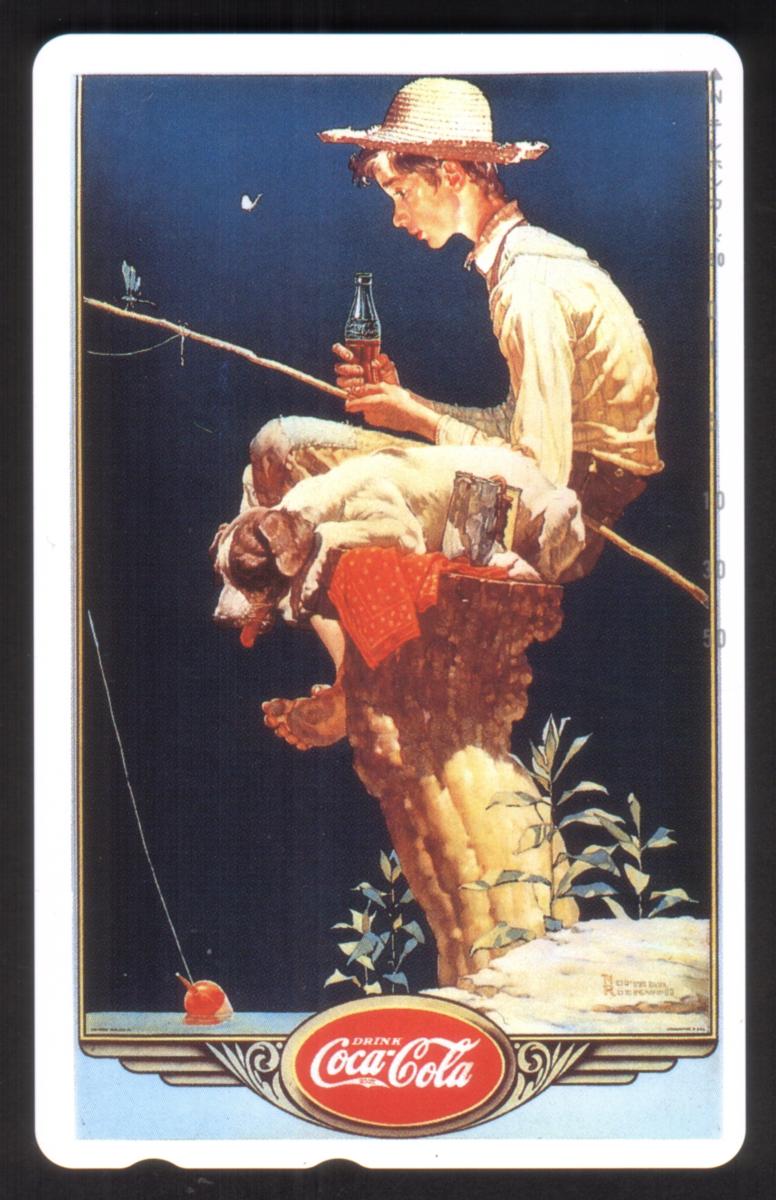 This collectible phone card from Japan features the iconic Norman Rockwell artwork titled "Bottle Boy & Dog Fishing," which vividly portrays a young boy sitting on a tree stump, fishing with a rod in one hand and holding a Coca-Cola bottle in the other. The boy wears a straw hat and casual clothing, and beside him rests a loyal dog with its tongue out, calmly observing the fishing scene. The distinct, detailed illustration style and use of light bring a nostalgic and peaceful atmosphere to the image.