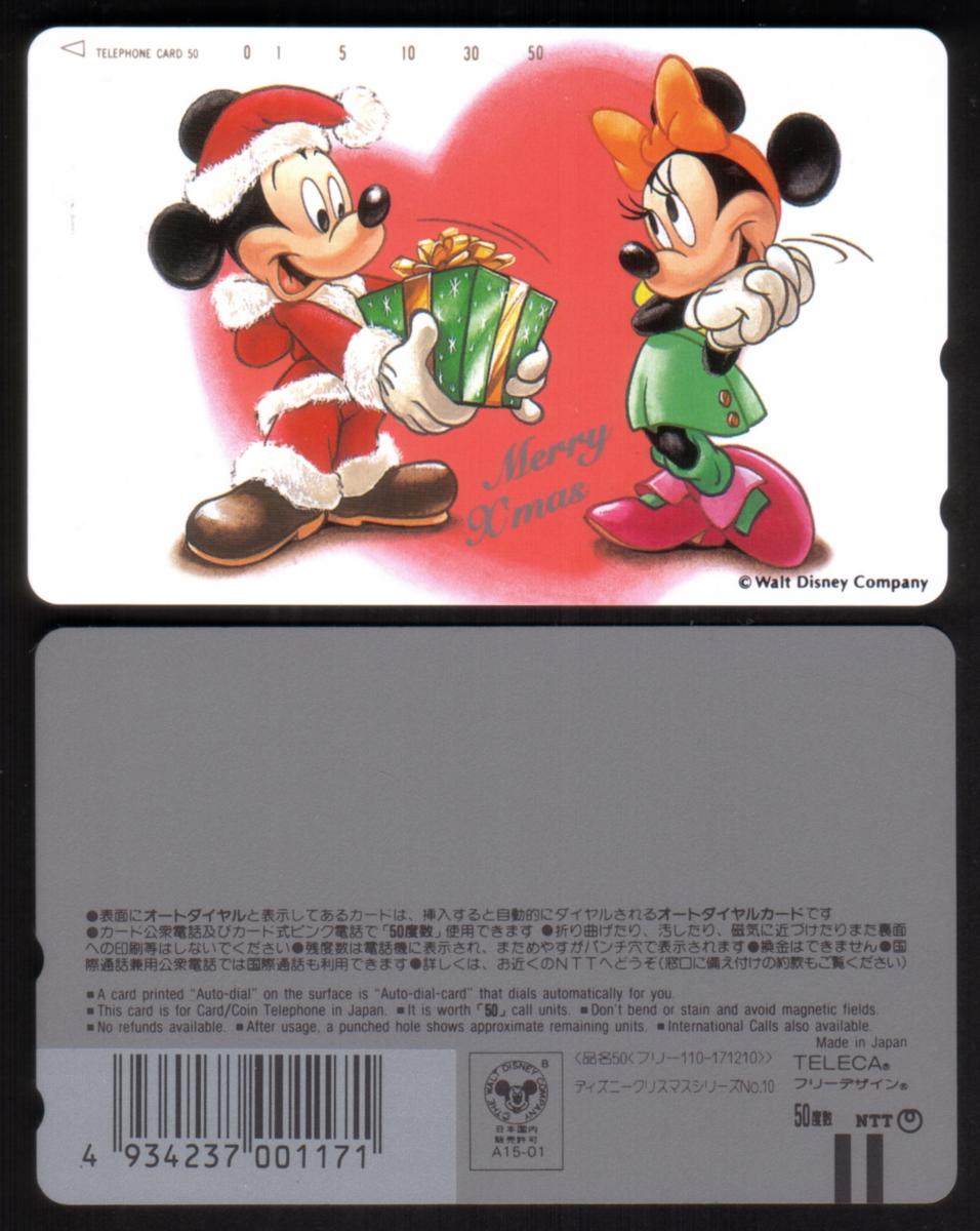 This collectible phone card from Japan features Disney characters Mickey Mouse, Minnie Mouse, and Santa Claus. The scene depicts Santa Claus giving a Christmas present to Minnie Mouse while Mickey Mouse looks on. The characters are illustrated in a classic Disney style. Santa Claus is dressed in his traditional red suit with white trim and black belt, holding a large gift box wrapped with a bow, extending it toward Minnie Mouse, who is wearing a red dress. Mickey Mouse stands beside them, smiling, dressed in his iconic red shorts and yellow shoes.
