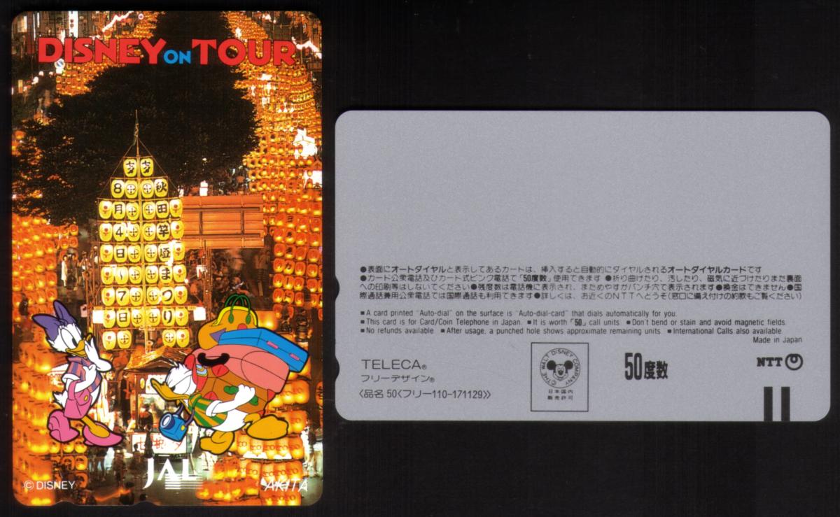 This item is a collectible phone card issued in Japan, associated with Japanese Airlines and Disney. The card’s design highlights travel and tourism involving Disney characters within a Japanese cultural setting, catering to collectors interested in Disney memorabilia, Japanese travel, or airline-themed items.