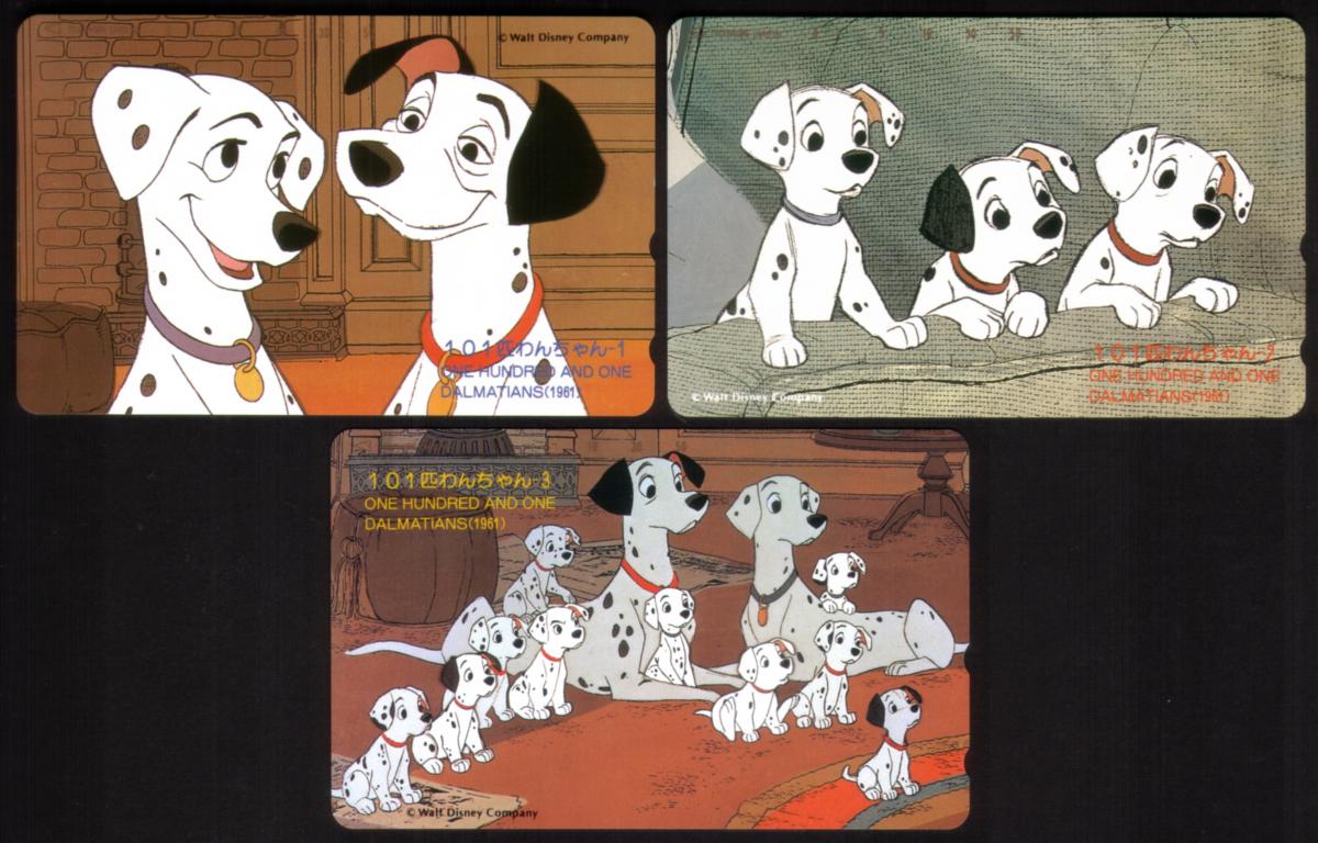 This item is part of a set of three collectible Disney phone cards issued in Japan. Each card in the set features different images of the Dalmatian puppies, emphasizing themes of animals and pets. The set is in mint condition and shows no signs of use such as holes or damage.