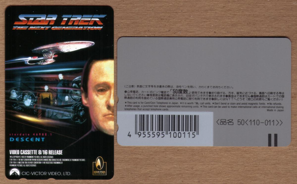 This collectible phone card from Japan features Commander Data from Star Trek: The Next Generation. The card highlights a promotional theme titled "Descent," directly referencing the Star Trek TNG episode. The artwork displays Commander Data prominently, with a close-up image of the character in his Starfleet uniform. The text on the card includes "Star Trek: The Next Generation," "stardate 46982.1," and "Paramount Pictures 1993," confirming its connection to the official video cassette release and its vintage origin.