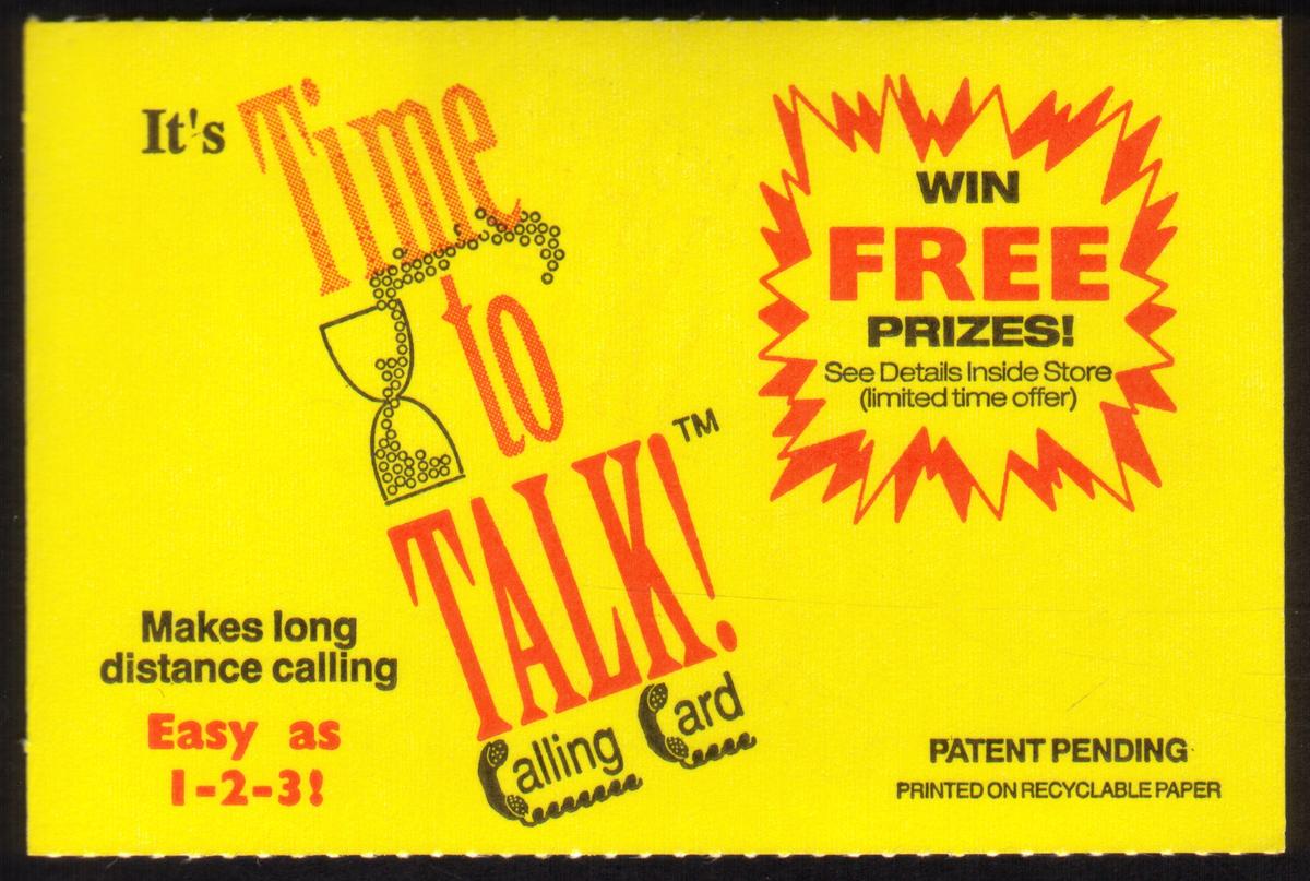 This item is a 30-minute paper phone card with a scratch-off coating and was part of a promotional set titled "It's Time To Talk," related to the "Time Machine" series of collectible phone cards. The design emphasizes communication and prize-winning opportunities for long distance callers.
