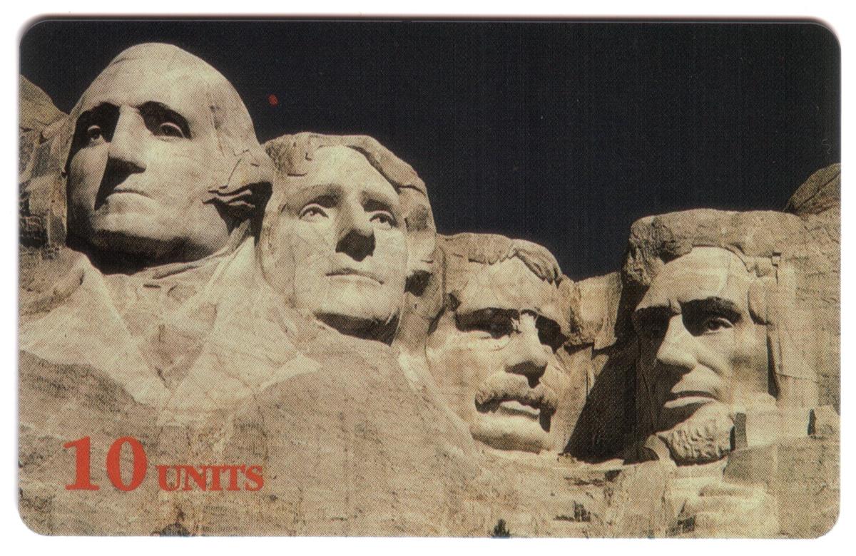 This collectible card features a close-up photographic image of the Mount Rushmore National Memorial located in South Dakota, USA. The sculpture portrays the carved faces of four U.S. presidents—George Washington, Thomas Jefferson, Theodore Roosevelt, and Abraham Lincoln—set against a dark sky background. The image captures detailed facial features and shadows on the granite monument.