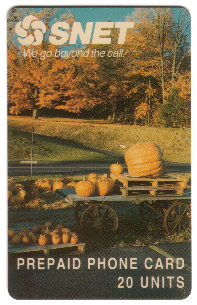 In the distance, a calm lake is visible, adding depth to the scenic composition. The sky above is clear, contributing to the bright and crisp mood of an autumn day. The card includes text indicating “SNET,” referring to Southern New England Telephone, linking it to the telecommunications provider. Additional text notes “Halloween 20u Pumpkins On Wagon,” confirming the subject matter and the card’s value.