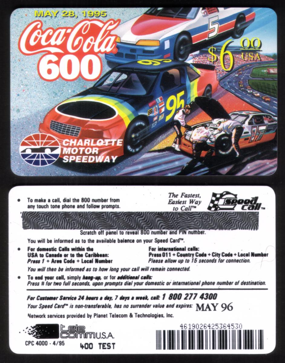 Vintage 1995 Coca-Cola 600 race scene phone card with NASCAR cars, speedway view, Coca-Cola logos, prepaid calling instructions, and $6 value. |