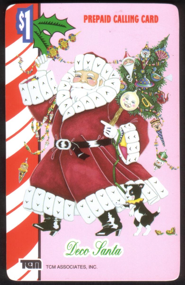 This collectible phone card features a festive Christmas-themed design titled "Deco Santa (1994 With Decorations)" by TCM Associates, Inc. The central image depicts a classic Santa Claus figure dressed in a traditional red suit with white trim, holding a candy cane in one hand. Surrounding Santa are several holiday elements including decorated Christmas trees and holly branches accentuated with red berries. Additional holiday decorations and ornaments are scattered around, enhancing the seasonal theme.