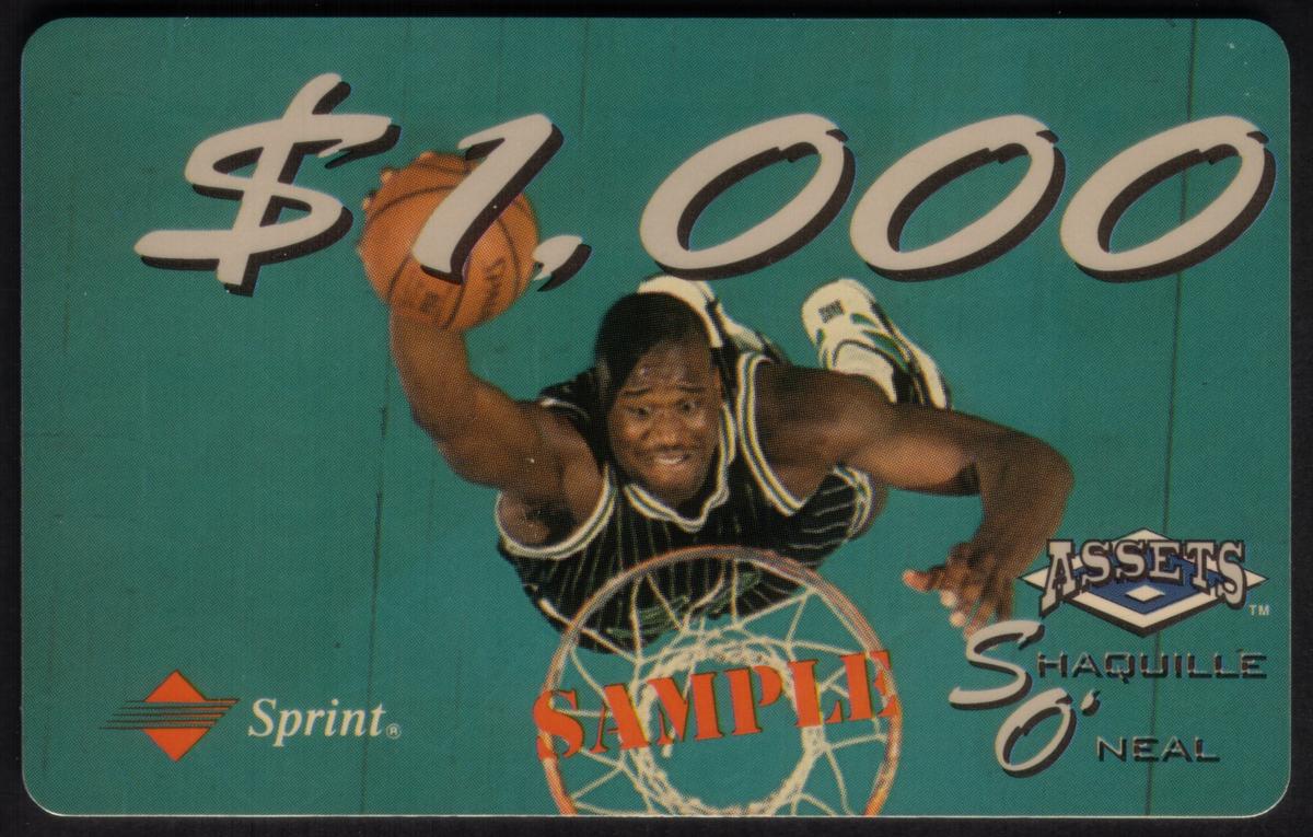 The fourth card presents a male basketball player, wearing a maroon jersey with the name "O’Neal" and number 30 on the back, pointing forward with a microphone in his hand, priced at $25. The fifth card shows a player in LSU basketball uniform number 33, sitting on the floor under a basketball hoop, with an orange basketball to the side and a $33 value. The sixth card is a $1,000 promotional card labeled "ASSETS Shaquille O’Neal" and features an overhead image of Shaquille O’Neal dunking a basketball with the text "SAMPLE" in orange.