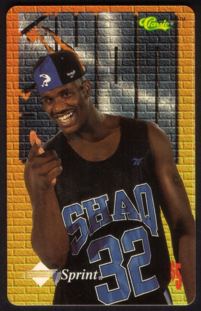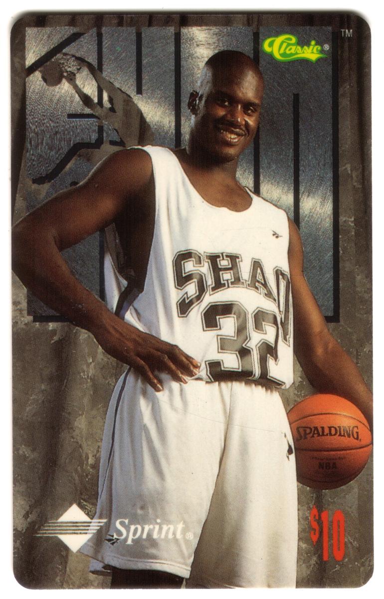This is a set of six collectible basketball-themed phone cards featuring Shaquille O'Neal and another basketball player. Each card prominently displays Shaquille O’Neal wearing different basketball jerseys with the number 32 and includes the Sprint logo. The cards have a consistent design with the "SHAQ" logo in large metallic letters in the background and the Classic logo in the top right corner.