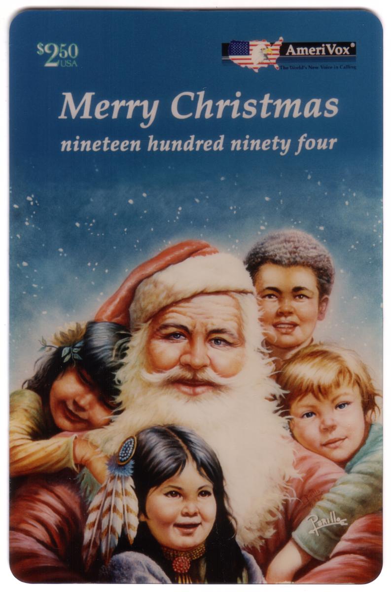 This card is a phone card intended for use within telecommunications. It combines holiday cheer with elements reflecting Native American culture, making it a unique collectible item celebrating Christmas in 1994. The overall composition highlights festive goodwill and children’s delight during the holidays, making it a notable piece for collectors of Christmas-themed phone cards.