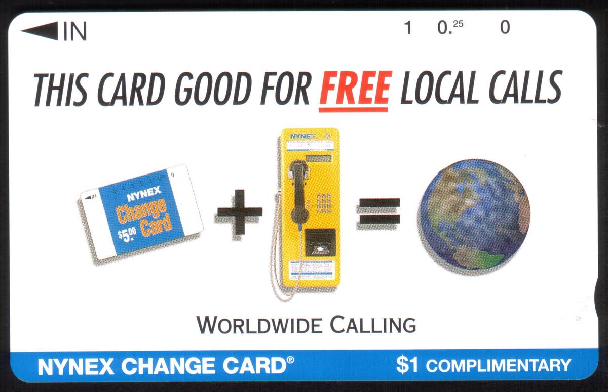 The card prominently displays the NYNEX and New York Tel logos, indicating its association with NYNEX Corporation and its local telephone service in New York. Printed on the card is the denomination of "$1," specifying its value for calling purposes. The overall design emphasizes the theme of global communication and connectivity, reinforced by the presence of the globe and map imagery.