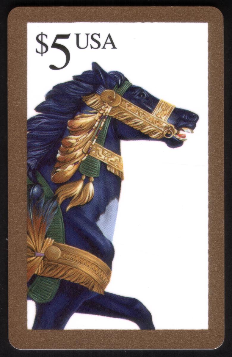 This collectible phone card features a festive design from the 1995 U.S. Postal Service Christmas Trial. The central image showcases a carousel horse, emphasizing the holiday spirit with a focus on Christmas and seasonal themes. The card carries the $5 first-class phonecard denomination, highlighting its use and collectible value. The artwork depicts a traditional carousel horse with ornate detailing, reflecting the charm and nostalgia associated with holiday celebrations.