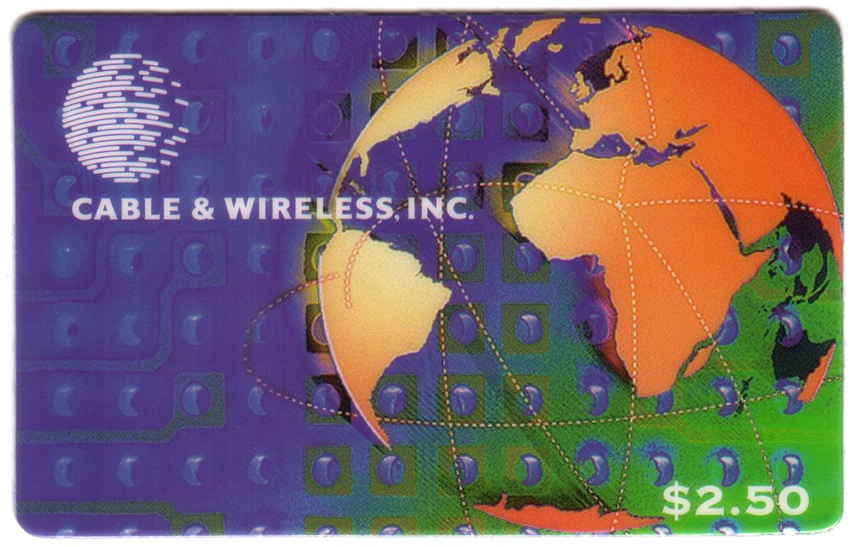 The card is issued by Cable & Wireless International (CWI), a well-known telecommunications company. The blue, green, and orange globes are arranged in a dynamic composition that conveys a sense of movement and energy, highlighting the company’s global reach. The text on the card includes the denomination of $2.50, clearly indicating its value for use as a prepaid corporate card.