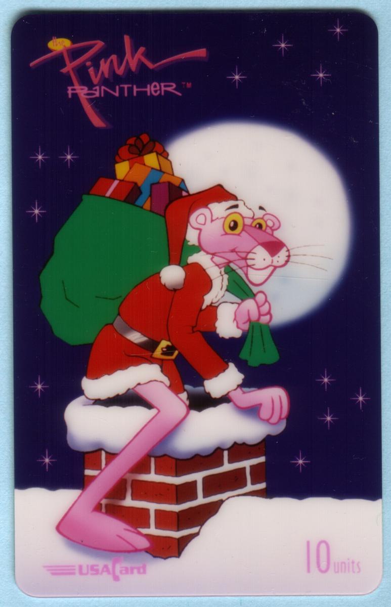 1995 Pink Panther Christmas phone card featuring Pink Panther as Santa on a snowy chimney under a starry purple sky with a glowing moon, 10 call units. |