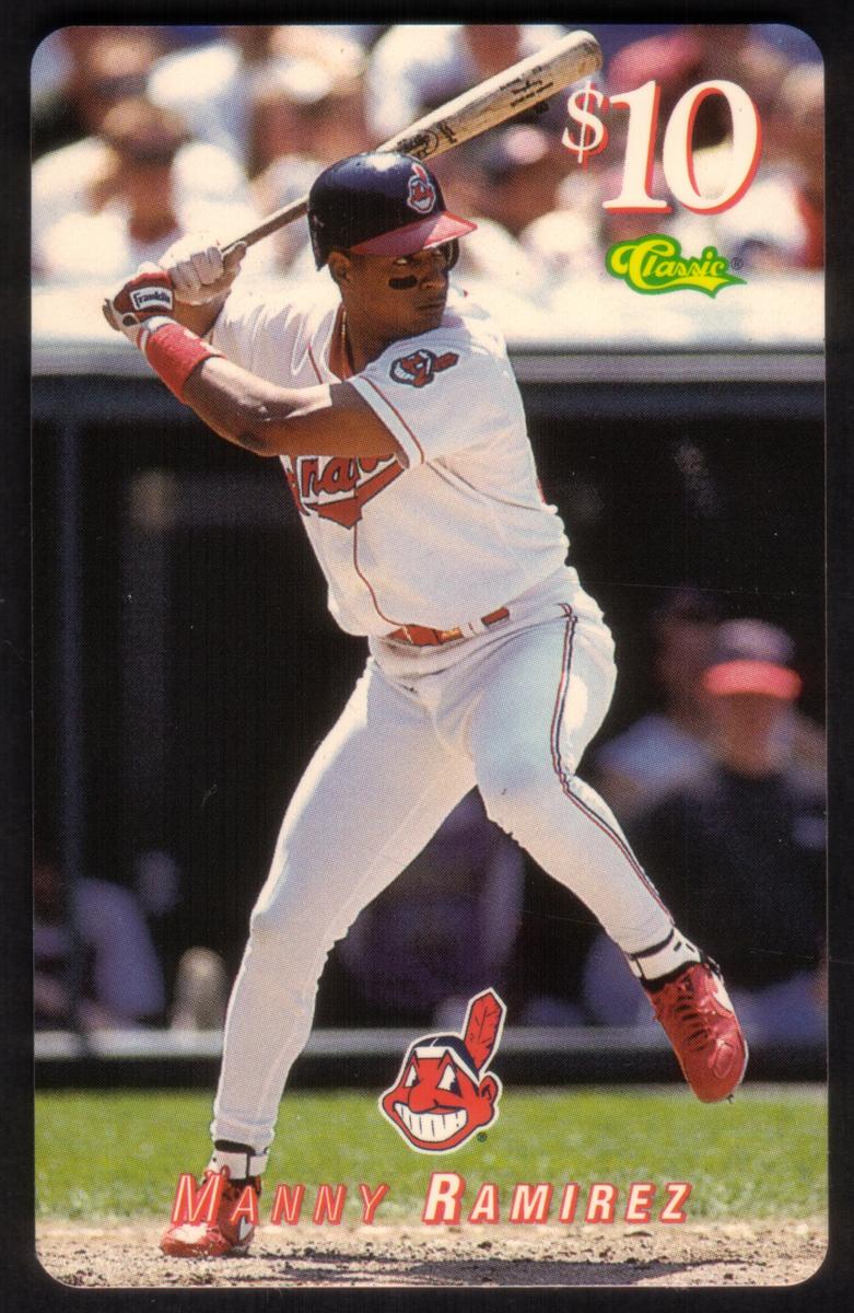 Text on the card identifies the player, Manny Ramirez, and specifies that the card has a $10 value associated with it. The overall design emphasizes the sport of baseball and the Major League Baseball league, with clear branding and official logos. The colors and layout reflect typical baseball card themes from the mid-1990s.