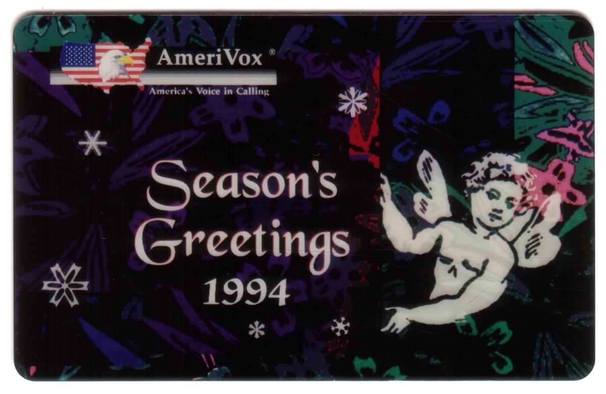 The top left corner of the card displays the text "5m Season's Greetings 1994" in elegant gold lettering. The word "AmeriVox" appears in the lower right corner, identifying the issuer. The background color is a soft, light tone that complements the warm hues of the angel and the holiday decorations, emphasizing the Christmas and holiday spirit captured in the design.