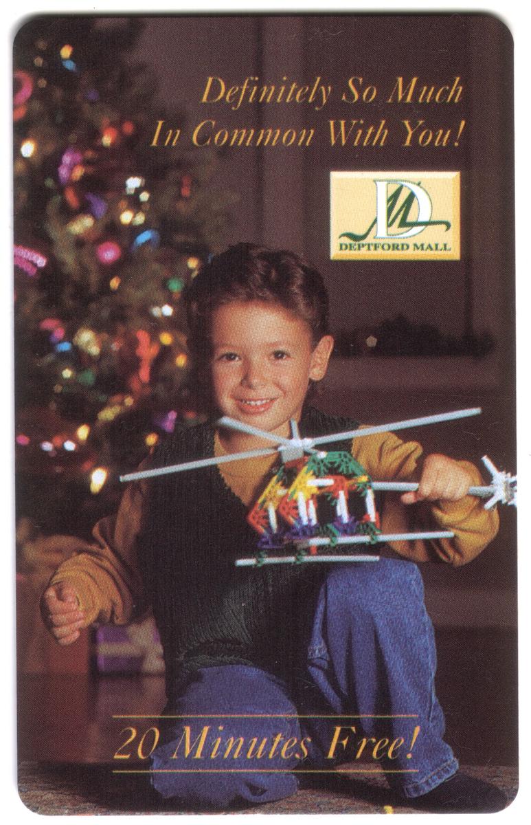 Overall, this phone card serves both as a collectible item and an example of advertising tied to Deptford Mall, New Jersey, featuring a seasonal motif with a child, toy helicopter, and branding consistent with the Christmas period.