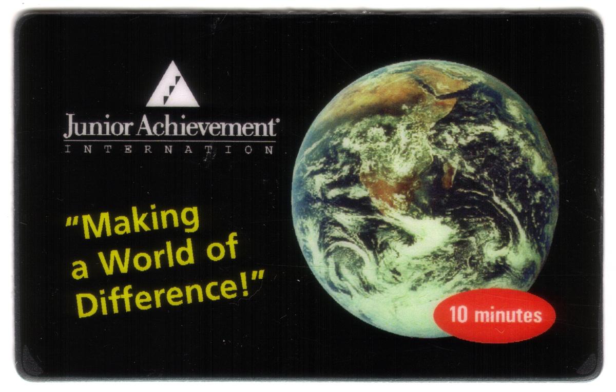This collectible phone card features a vibrant image of a globe floating in outer space, highlighting the Earth with clear blue oceans and visible continents. Surrounding the globe are inspiring words arranged in a circular pattern: "children kids education youth programs youth organizations non profits non profit organizations globes earth outer space making a world of difference." The phrase "10m Junior Achievement 'Internation' Globe In Space (A World of Diff)" appears prominently, linking the card to educational and youth-focused initiatives.