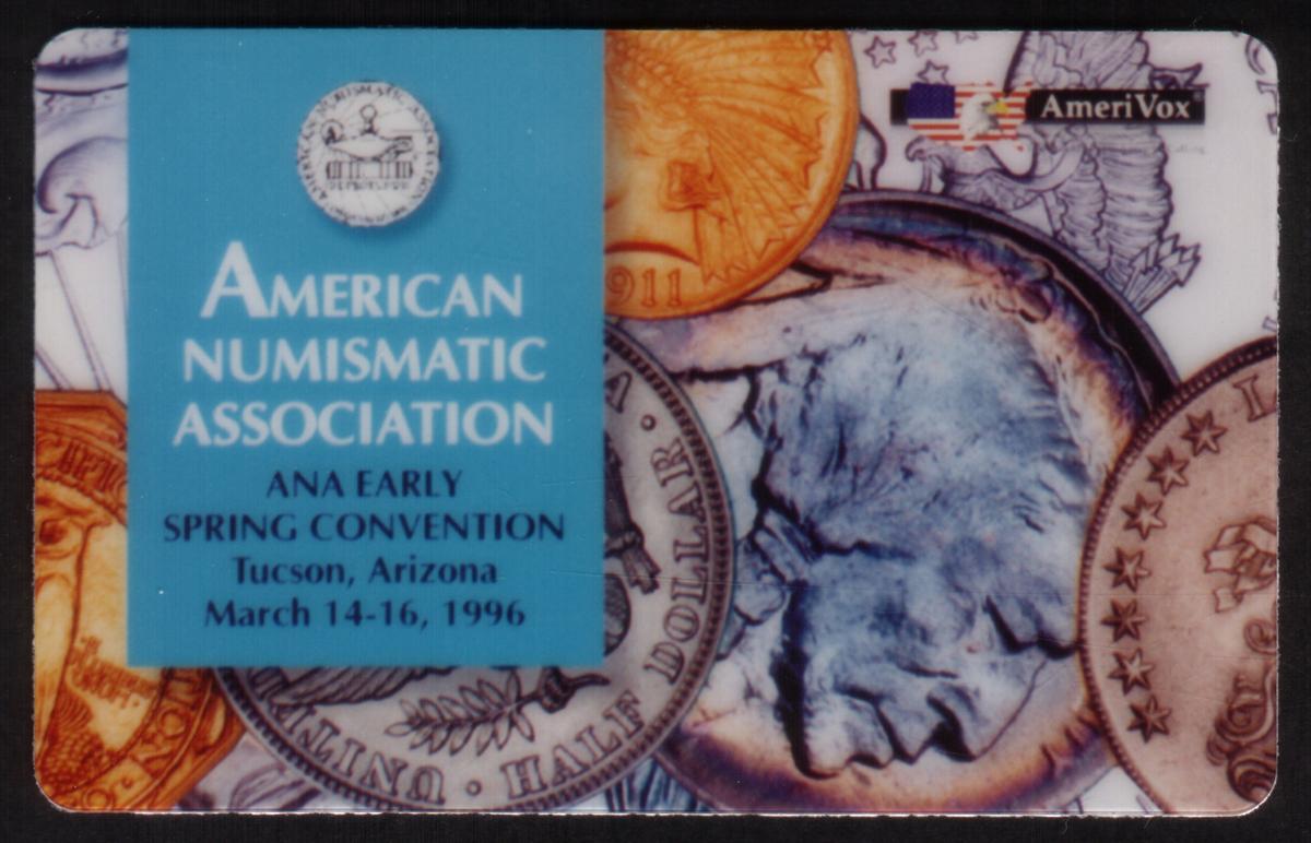 Commemorates the 1996 ANA Spring Convention in Tucson with detailed U.S. coin imagery, event details, and collectible appeal for numismatics enthusiasts. |