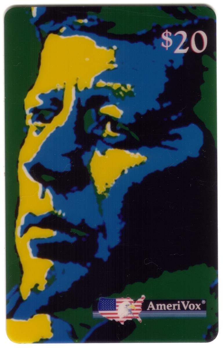 This collectible phone card showcases a stylized, close-up portrait of John F. Kennedy, the 35th President of the United States, rendered in a vibrant, abstract palette of blue, yellow, black, and green. The artwork channels a pop-art and modernist aesthetic, evoking the spirit of the 1960s—the era most closely associated with Kennedy’s legacy. The portrait captures his serious, determined expression, reflecting the youthful vigor and leadership that defined his presidency. Titled "Young Patrician," the image pays homage to JFK’s distinguished heritage, charismatic presence, and poised statesmanship. The card’s $20 denomination is prominently displayed in the top right corner, while the bottom right features the "AmeriVox®" logo adorned with an American flag motif, underscoring the card’s patriotic theme and telecommunications purpose.