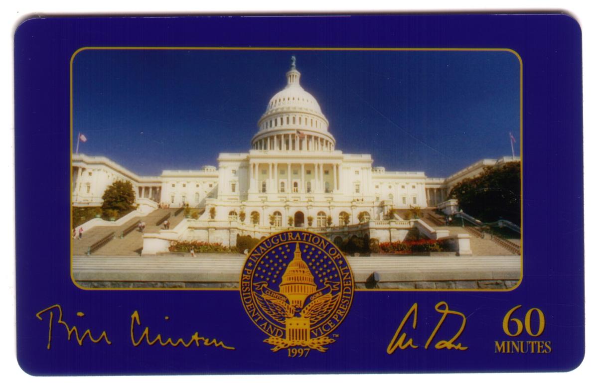 Marked with “60 MINUTES” in bold gold lettering at the lower right corner, the card serves as a prepaid telephone card valid for 60 minutes of call time—combining practical use with patriotic significance. This dual function highlights a unique blend of everyday utility and historical tribute, offering users and collectors a tangible connection to the 1997 inauguration, which marked the start of the Clinton-Gore administration’s second term. The card’s theme naturally resonates with those interested in U.S. presidents, American history, and key Democratic Party milestones.