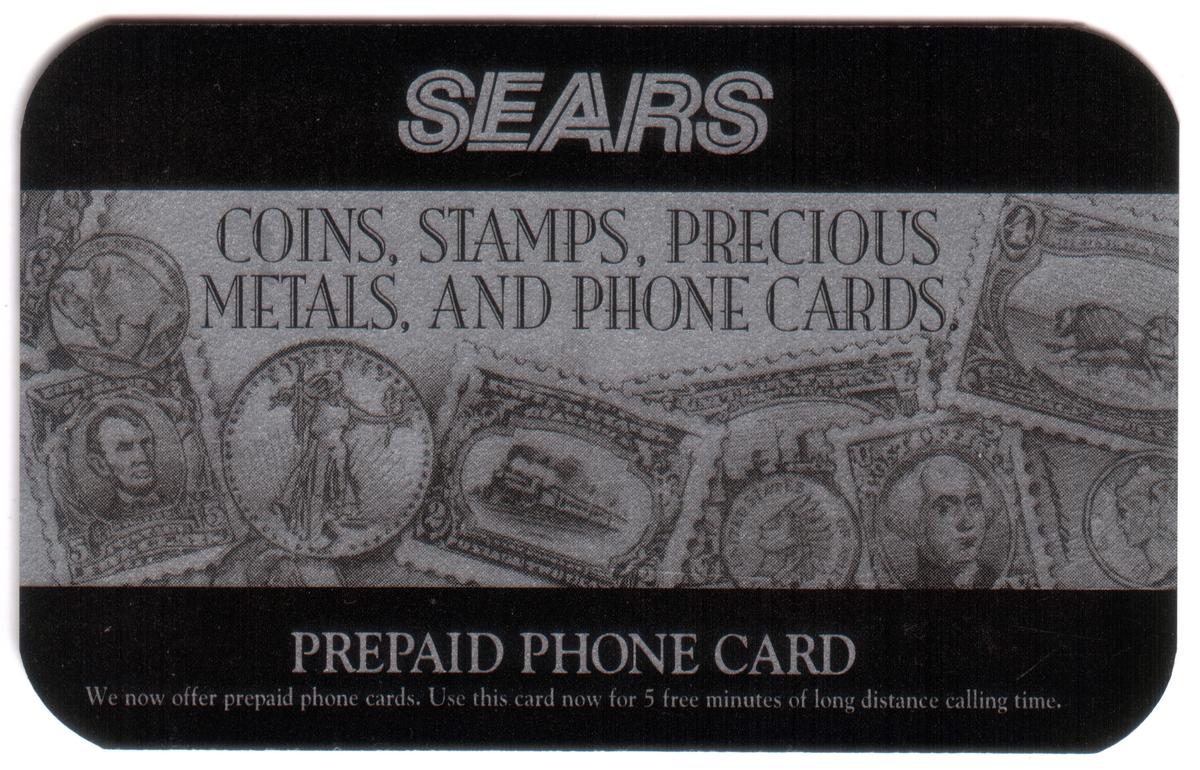 Sears promotional prepaid card featuring coins, stamps, and precious metals themes, with vintage imagery, Americana symbols, and 5 free minutes of calling. |