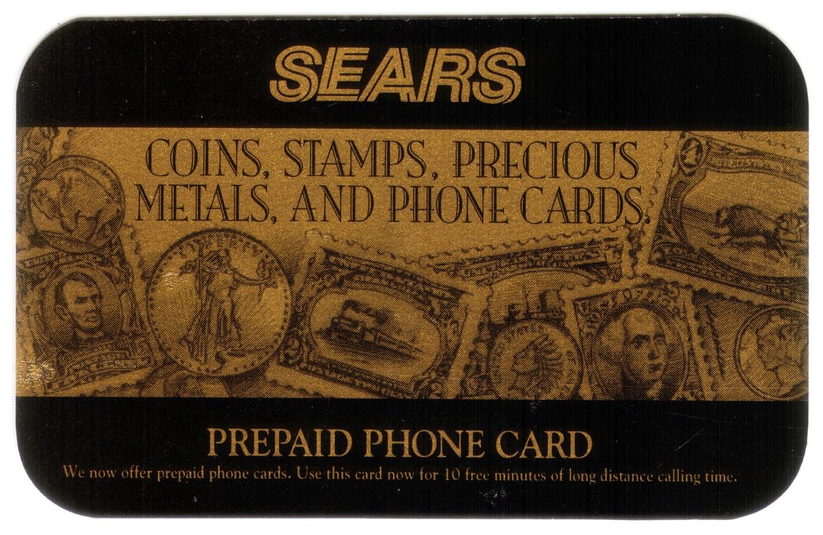 This collectible prepaid phone card from Sears stands out as a remarkable piece of vintage promotional material, blending numismatic and philatelic themes with the functionality of a business card. At the top, the Sears logo is prominently displayed in bold gold lettering against a striking black and gold background. The main text boldly proclaims "COINS, STAMPS, PRECIOUS METALS, AND PHONE CARDS," highlighting Sears’ broader marketing strategy that extends beyond phone services to include a variety of collectibles and specialty items. This card is part of a unique Sears promotion targeting collectors and enthusiasts interested in coins, stamps, precious metals, and phone cards alike.