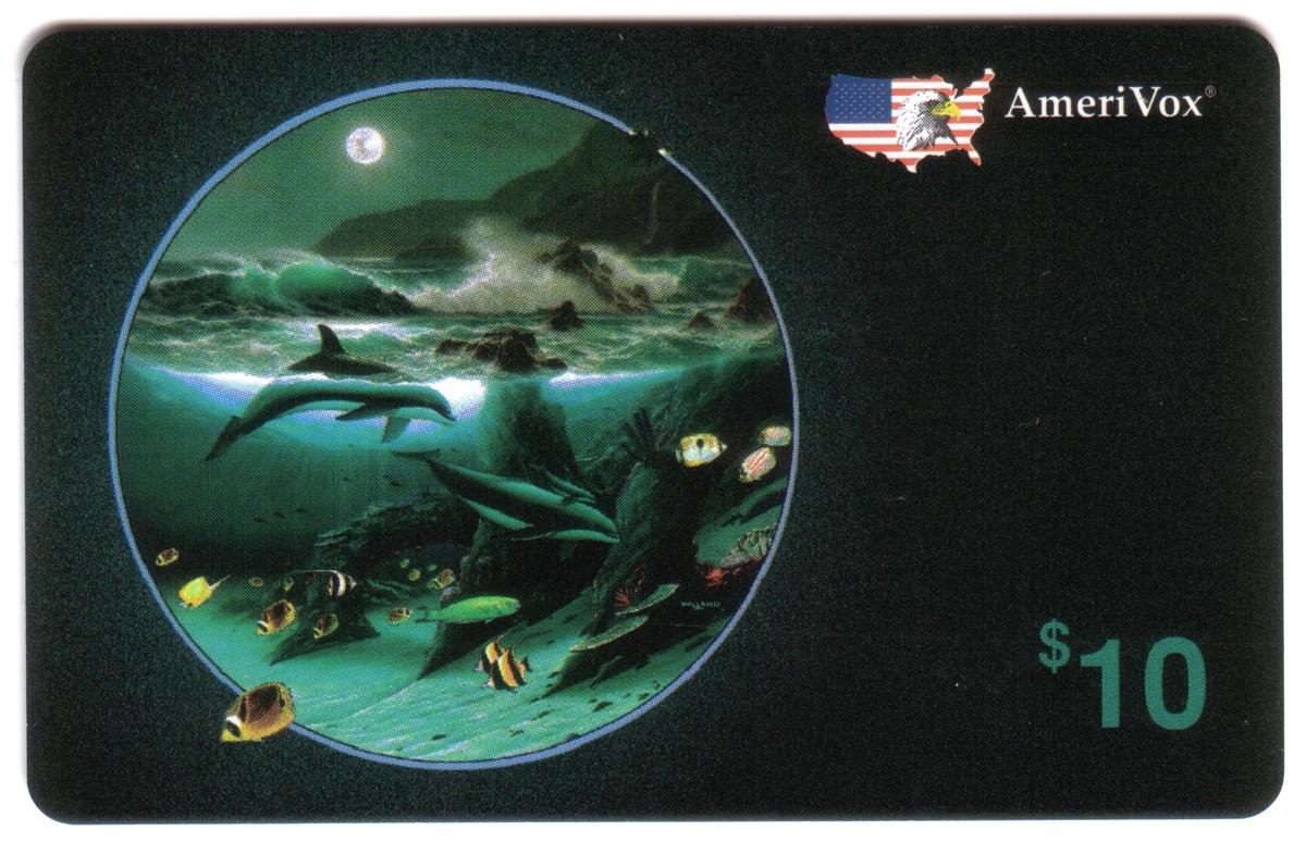 Produced by AmeriVox, this $10 card from the Wyland Whales Series emphasizes themes of sealife, tropical fish, and aquatic animals. The text on the card clearly identifies it as part of this series, reinforcing its link to marine animal art and the dedication to raising awareness of oceanic wildlife.