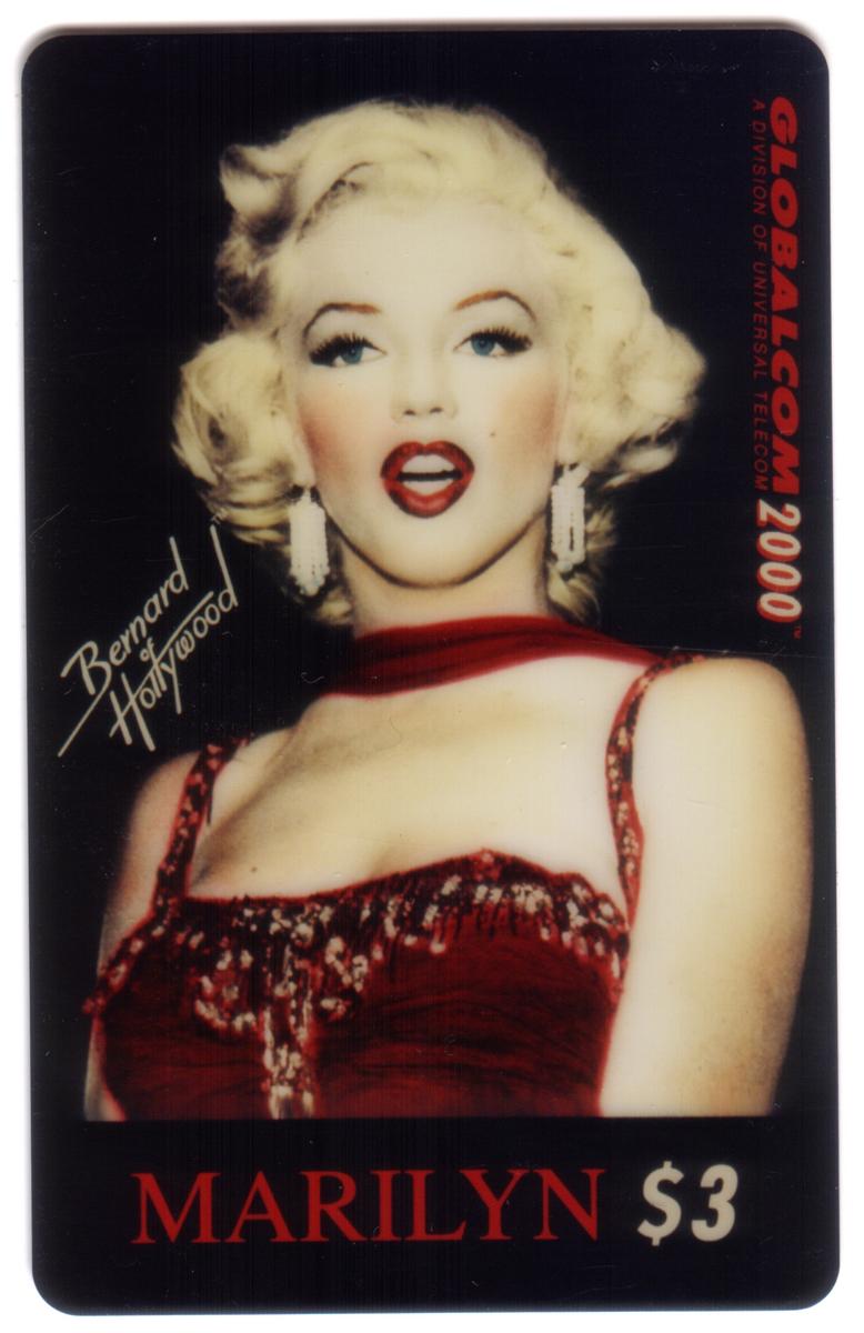 The card includes text that clearly identifies Marilyn Monroe, along with references to Christmas 1993, indicating a possible commemorative release date or theme. The card is marked as a US Tel $3 collectible, linking it to telecommunications, likely as a collectible phone card issued by Globalcom in the year 2000. Additional text includes references to films, movie stars, women entertainers, and celebrities, highlighting Marilyn Monroe’s enduring legacy in film and popular culture.