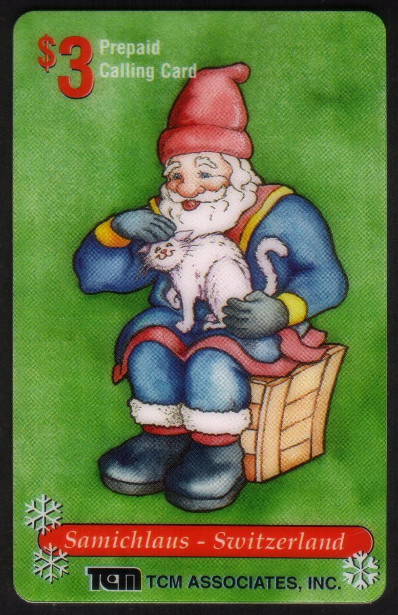 The collectible chip card features a festive Christmas theme centered on Swiss Santa Claus, known locally as "Samichlaus." The main image depicts Samichlaus petting a cat, showcasing a warm and gentle moment between the traditional figure and an animal. Samichlaus wears his distinctive red robe and hat trimmed with white, embodying the classic Santa Claus look associated with Swiss holiday traditions.