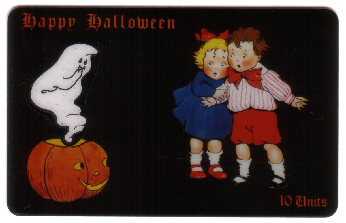 Additional text on the card includes “USACard Corporation,” the issuer of this collectible phone card. The overall design blends traditional Halloween elements such as ghosts and pumpkins with a modern collectible phone card format. The card connects to the celebration of Halloween and pagan holidays, emphasizing themes of children and ghosts appropriate to the holiday’s imagery.