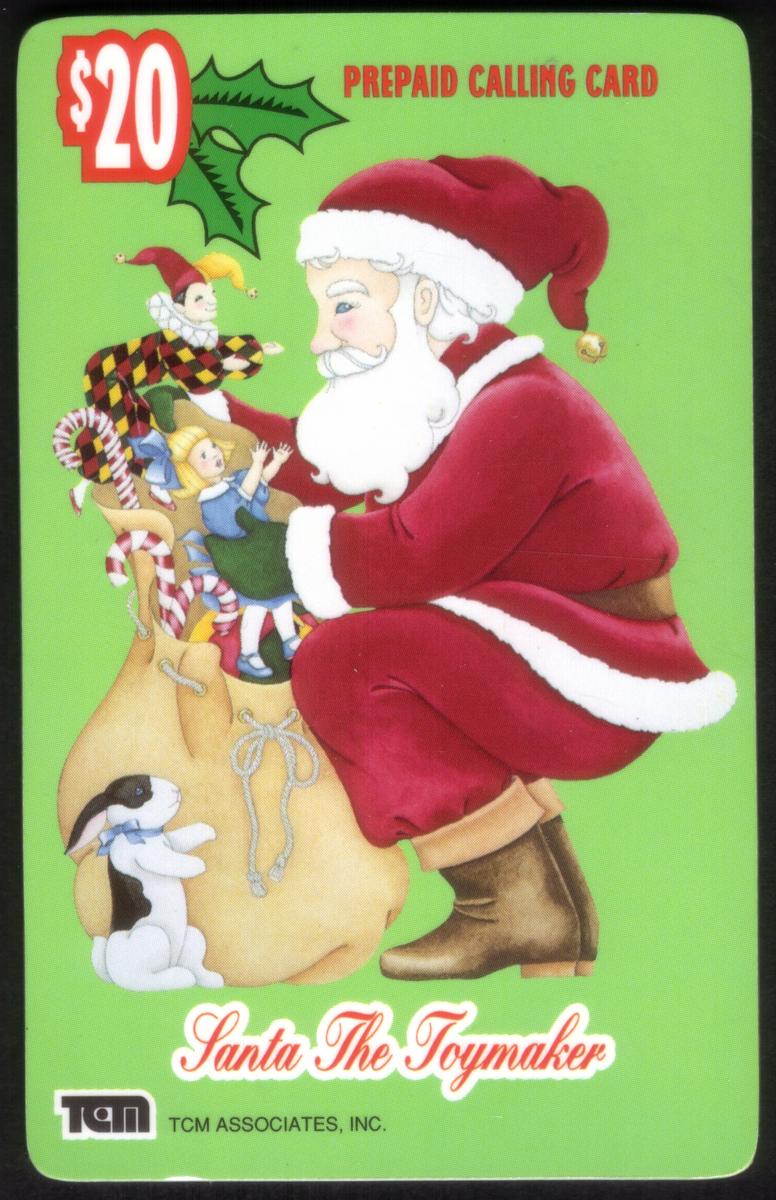 At the bottom of the card, the issuing company is identified as TCM Associates, Inc. The overall color palette includes warm reds, greens, and whites, classic for Christmas imagery. This card celebrates the joyful spirit of Santa Claus as a toymaker providing gifts during the holiday season.