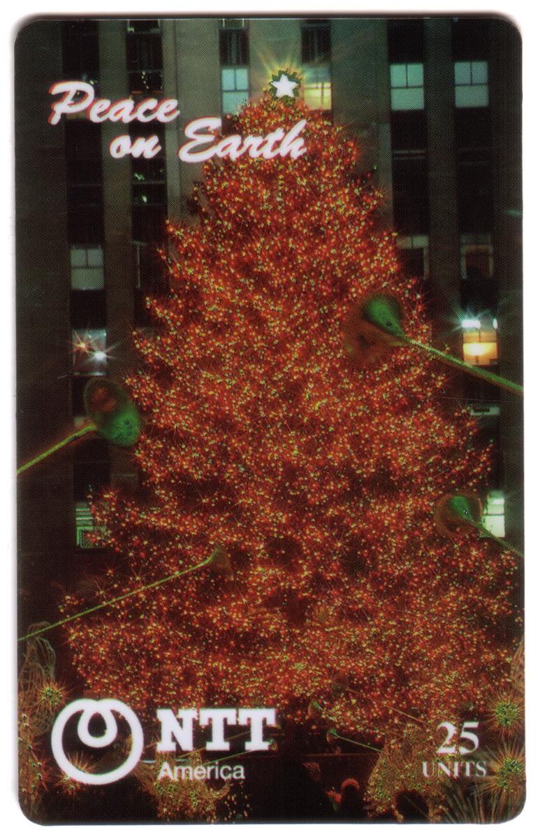 This collectible phone card features a festive Christmas design issued in 1994 by NTT America. The main image showcases a brightly lit Christmas tree adorned with colorful lights and ornaments, positioned prominently against a dark background that highlights the tree's illumination. To the right of the tree are two brass horns, which add a musical holiday theme to the card’s artwork. Above the horns, the phrase "PEACE ON EARTH" appears in uppercase white letters.