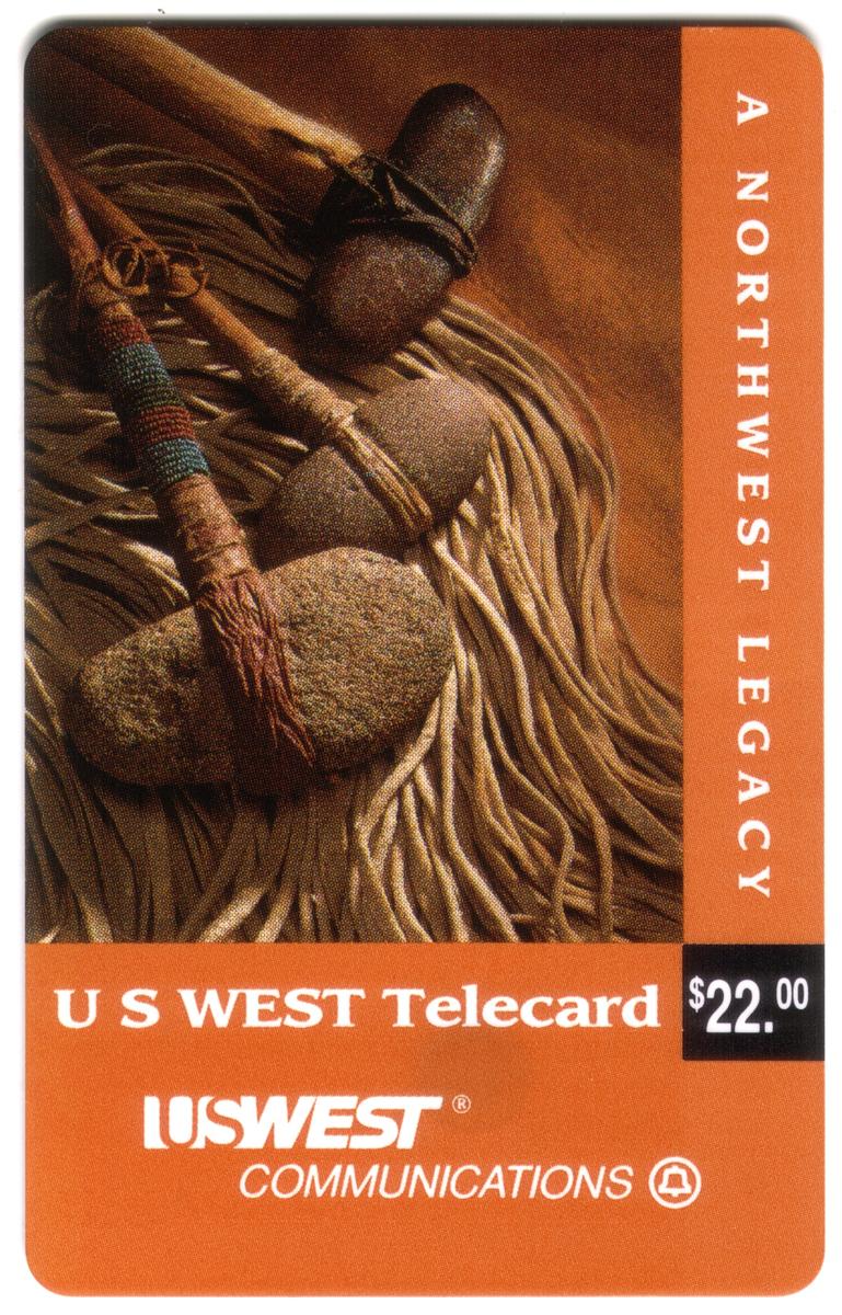 Text on the card reads “NorthWest Legacy #2: Early 1800’s War Clubs - U.S. West Commun.” and lists the price as $22.00. The label indicates a connection to warrior clubs and sacred tribal artifacts, emphasizing the historical context and cultural heritage of the Warm Springs Confederated Tribes. The card respects and honors Native American traditions and artifacts without offering any fictional or speculative elements.