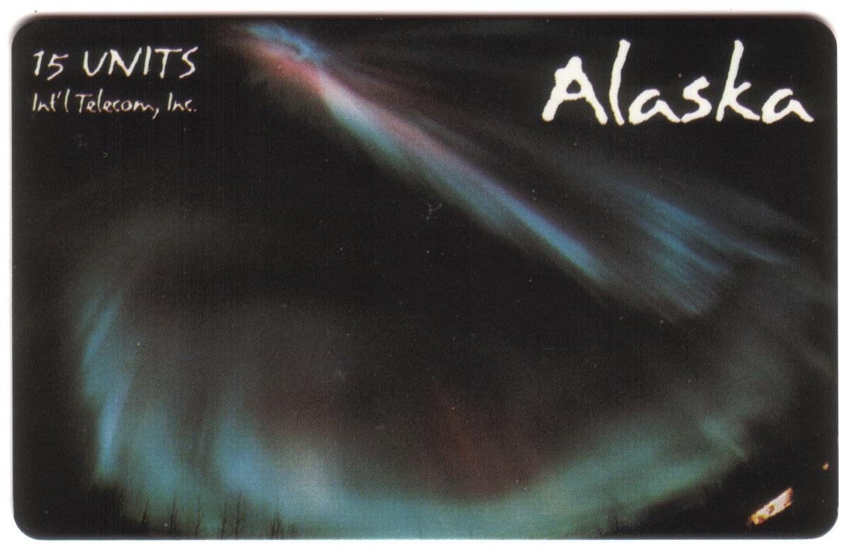 Alaska Aurora Borealis collectible phone card featuring a stunning photograph of the Northern Lights, 15 units, with microchip technology, ideal for collectors and travelers. |