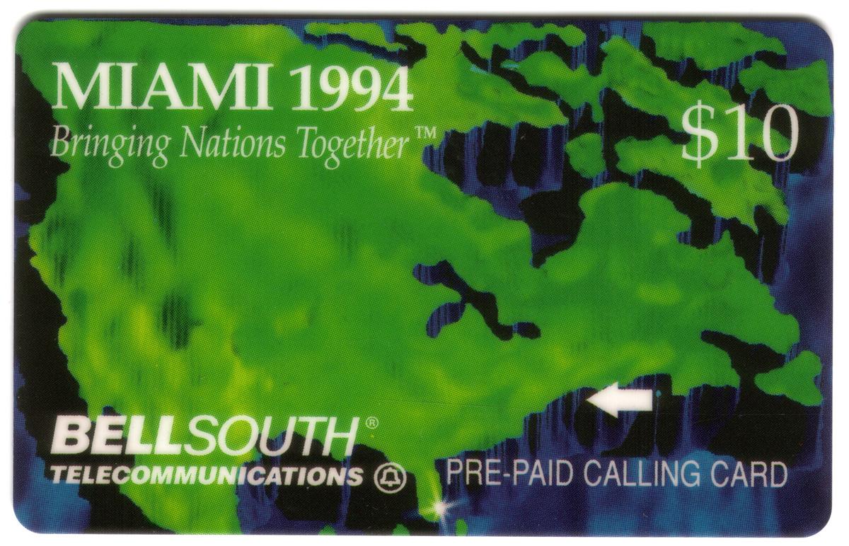 This collectible phone card commemorates the 1994 Summit of the Americas held in Miami, a landmark event in international diplomacy focused on "Bringing Nations Together." Featuring a prominent "$10" value in the upper right corner, this BellSouth Telecommunications prepaid calling card blends practical functionality with historical importance. Its design showcases vibrant green and blue hues forming a stylized map of the Americas, highlighting the summit’s geographic scope. The bold white inscription "Miami 1994" at the top left proudly marks the year and location of this pivotal gathering, which aimed to strengthen cooperation among countries across North, Central, and South America.